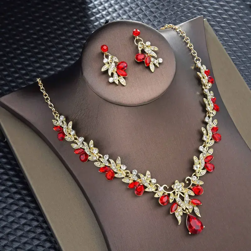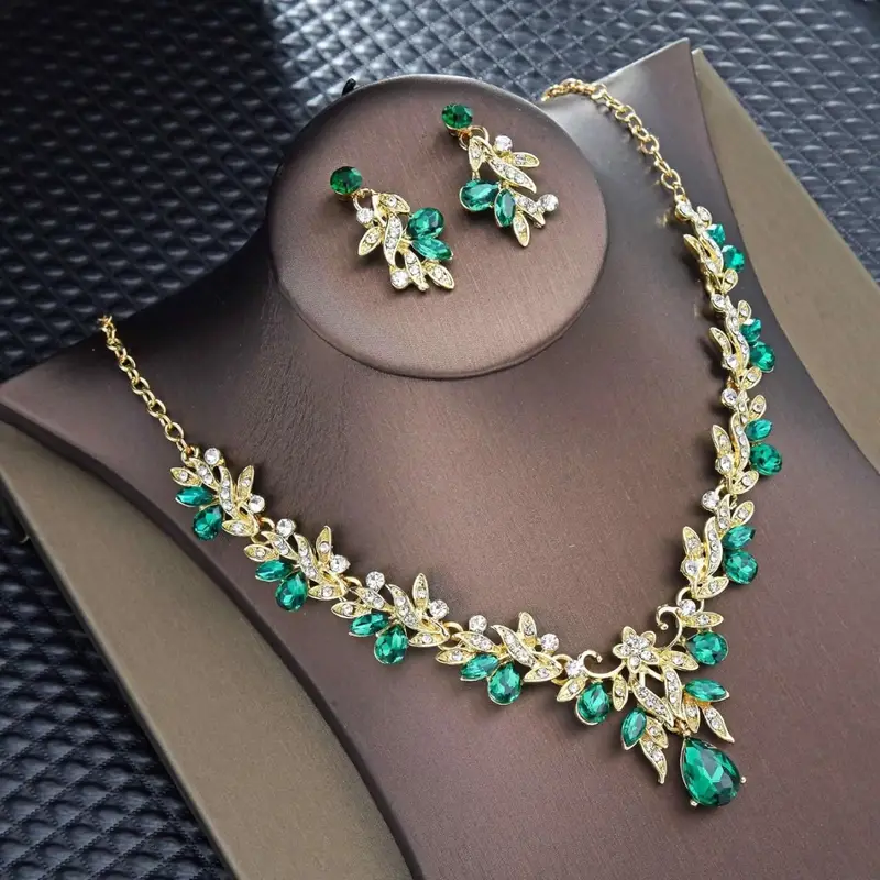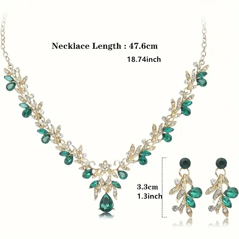 Make every special occasion unforgettable with this 3pcs Golden Necklace and Earring Set, crafted for women who love elegance, color, and timeless style. Designed with sparkling green and red rhinestone teardrops, this bridal-inspired jewelry radiates charm and luxury, making it a perfect choice for weddings, parties, banquets, and festive celebrations.
